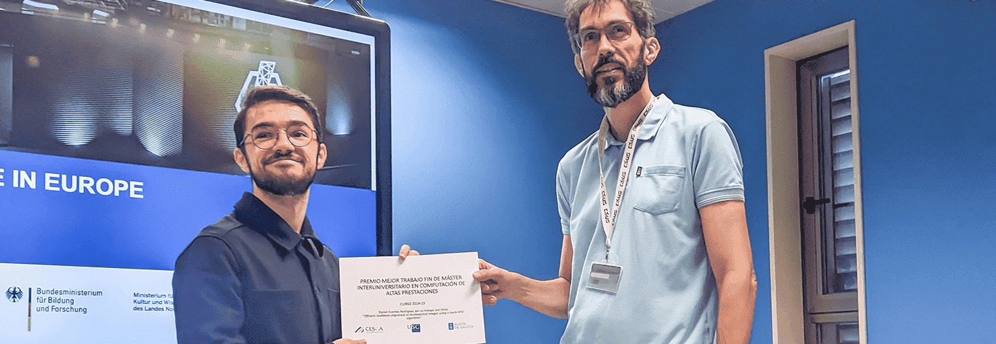 Daniel Fuentes, investigador del CiTIUS (un centro cofinanciado por la Unión Europea a través del Programa Galicia Feder 2021–2027), acaba de recibir el premio al mejor Trabajo Fin de Máster (TFM) del Máster en Computación de Altas Prestaciones, impartido por las universidades de A Coruña y de Santiago de Compostela en colaboración con el Centro de Supercomputación de Galicia (CESGA).